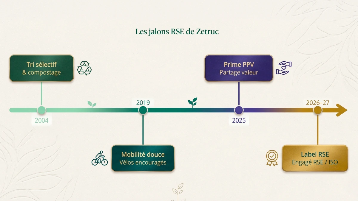 La RSE, c’est souvent le premier argument mis en avant dans une réponse à appel d’offres, et le dernier truc pratiqué au quotidien. On connaît le genre : une page « engagements » bien illustrée, trois phrases sur la planète, et on passe à autre chose. Chez Zetruc, on a choisi une autre trajectoire : agir avant de formaliser. Nos pratiques précèdent nos discours. Ce mémoire RSE en est la preuve.