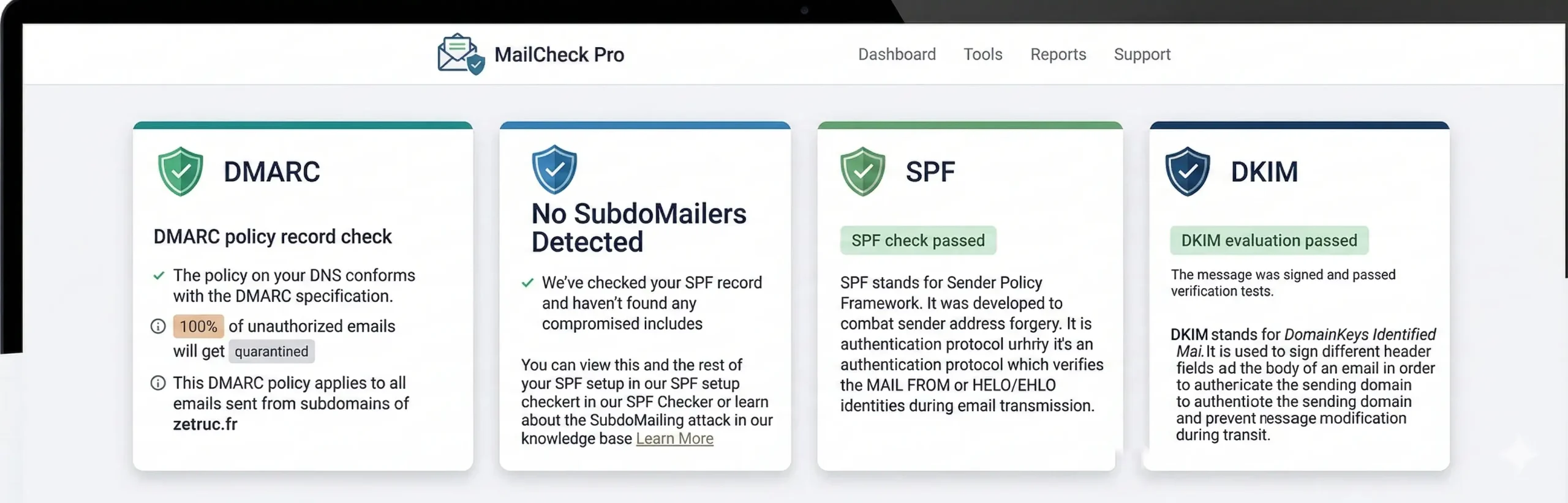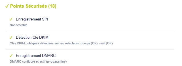C’est précisément pour répondre au besoin de visibilité sur ces sujets que nous avons développé Ze Audit Web, notre outil innovant d’analyse des points faibles de votre site internet. Parmi les points vérifiés, Ze Audit détecte notamment le déploiement et la configuration des protocoles SPF, DKIM et DMARC associés à votre nom de domaine.