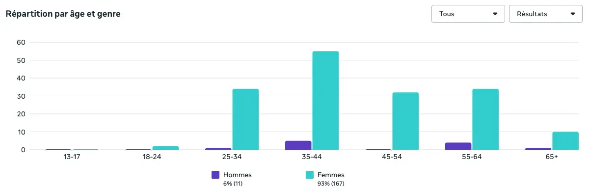 • Le Résultat : Sans aucun ciblage manuel restrictif, la publicité a « acheté » d’elle-même une audience ultra-qualifiée. Les données de répartition sont sans appel : 93 % de l’audience touchée sont des femmes, avec un cœur de cible massif sur les 35-44 ans.