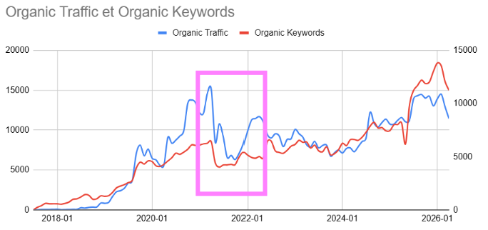 Un de nos clients e-commerce en a fait les frais en 2021. Lors de la refonte de leur site, les redirections n’avaient pas été correctement configurées. Résultat : le trafic organique, qui atteignait plus de 14 000 visiteurs mensuels, a chuté à moins de 9 000 en quelques semaines. Les mots-clés positionnés ont suivi la même courbe, comme le montre le graphique ci-dessous.
